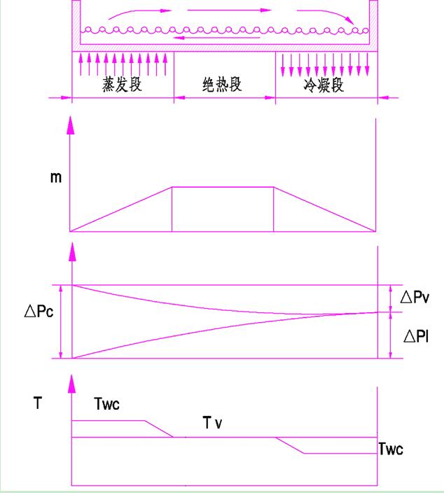 其中△pc:毛细压头—是热管内部工作液体循环的推动力,用来克服蒸汽从蒸发段流向冷凝段的压力降△pv,冷凝液体从冷凝段流回蒸发段的压力降△pl,和重力场对液体流动的压力降△pg(△pg可以是正值,是负值或为零,视热管在重力场中的位置而定)。